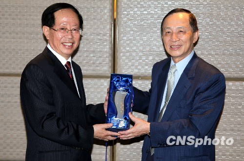 5月20日,海峡两岸农业交流协会与台湾二十一世纪基金会在台北举行座谈会,并签订2010年合作备忘录。图为二十一世纪基金会董事长、前台南县长高育仁(右)向首度访台的海峡两岸农业交流协会名誉会长危朝安赠送礼品,礼品上刻“研发 创新 和平”等字样。 中新社发 董会峰 摄