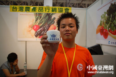 台南县学甲果菜运销合作社江菊明介绍说,他们的参展品是以绿色农作物为原料的护理品,其中,一种用大米提炼物加工而成“玄米膏”,绿色的膏体没有任何化学添加剂。据称,这种类似于“万金油”的膏剂,不但可以驱蚊虫,将它涂在虎口处还有开胃的功效。记者统计了一下,在短短的3分钟里,该展区的工作人员就婉拒了十几个参观者的购买要求。