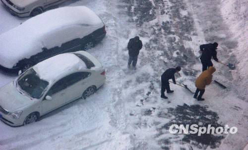 一月四日周一,在两天大雪过后,北京市民上街铲雪。市政府已经在日前之夜号召市民企业、事业单位,各家自扫门前雪,分片包干,畅通北京交通。 中新社发 邹宪 摄