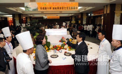 3月18日,台北中华美食交流协会执行长梁幼祥、马祖餐饮交流协会总干事林中超等闽台烹饪美食业界嘉宾在此间展出的马祖餐饮交流协会展示台前观摩交流。