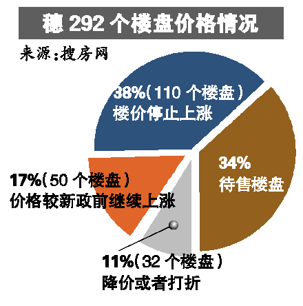 搜房网近日统计了全市292个楼盘,其中有50个楼盘价格较新政前继续上涨,占比高达17%;楼价停止上涨的楼盘有110个,占比为38%;只有32个楼盘出现比较明显的降价或者打折,占比为11%;另外34%为待售楼盘。而二手市场上,一些投资型业主开始抛售房源,但是降价幅度一般都在5%~10%左右。