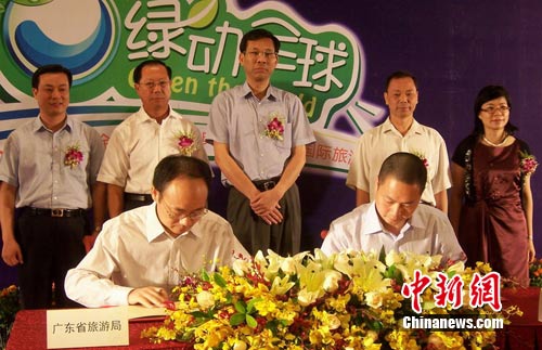 中新网广州8月30日电 (莫非 颜海冰 赵丽帆)旅游业界与网络游戏跨界合作开始显山露水。30日上午,广东省旅游局与网易战略合作签署仪式暨“绿动全球”网络游戏启动仪式在广州举行。国家旅游局副局长王志发、广东省副省长刘昆、省旅游局局长杨荣森、网易副总裁、总编辑李甬等出席仪式。