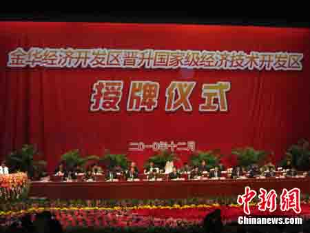 中新网金华12月15日电(记者严格 胡旭明)今天上午,金华开发区晋升国家级经济技术开发区授牌仪式在金华隆重举行。浙江省副省长龚正、商务部部长助理房爱卿向金华经济技术开发区授牌。金华开发区也将成为浙中唯一一家国家级经济技术开发区。