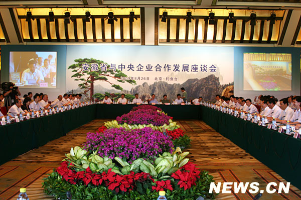 8月26日,安徽省省长王三运率领安徽17个市负责人及省属企业主要负责人的政府代表团进京,与中央企业举行合作发展座谈会,表达了安徽省与中央企业合作联姻的诚意和强烈愿望。