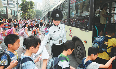 重庆女子交巡警队员在护送小朋友上车。 新华社记者 陈诚摄