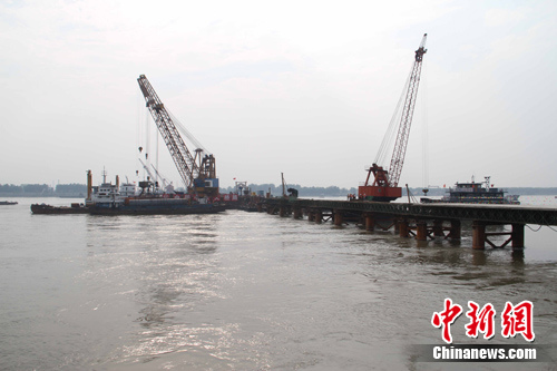 正在建设中的武汉至黄冈城际铁路控制性工程黄冈公铁两用长江大桥