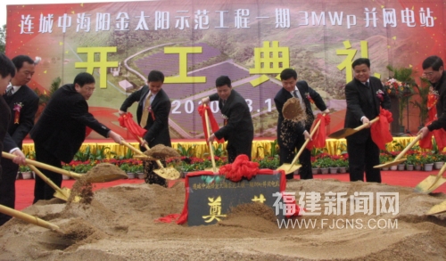 福建新闻网连城3月16日电(黄水林) 福建首座兆瓦级大规模光伏电站项目——连城中海阳金太阳示范工程一期3MWP(兆瓦)并网电站,16日上午在连城县工业园举行开工奠基仪式。