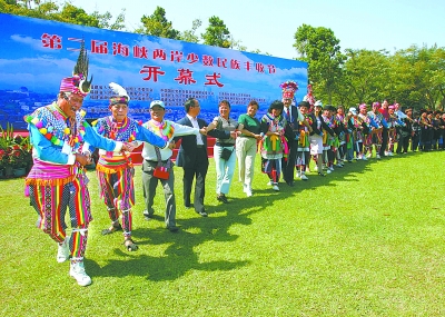第二届海峡两岸少数民族丰收节上,两岸民众手牵着手,载歌载舞。记者 关建东 摄