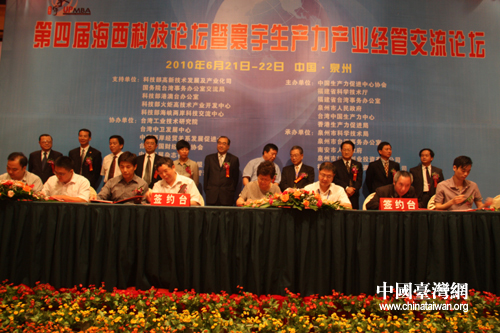中国台湾网6月21日泉州消息 以“加强科技创新 服务中小企业”为主题的第四届海西科技论坛暨寰宇生产力产业经管交流论坛今日上午在泉州开幕,海峡两岸科技合作项目对接签约仪式同期举行。