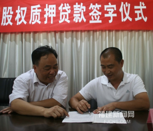 6月30日,东山县铜陵兴顺水产冷冻加工厂法人代表林火国(右)在东山县农信联社股权质押贷款合同书上签字。(左)为东山县农村信用合作联社理事长张赞河。