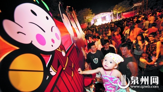 昨晚,一名小朋友在文化创意产品市集上被卡通式的火鼎公婆所吸引。当晚,泉州市首届创意文化节开幕式暨音乐文化表演在市区府文庙广场拉开帷幕,活动中各种创意十足的饰品、服装、玩具等文化创意产品吸引了众多市民的眼球。(张九强 摄)