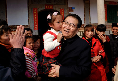 这是3月25日,李长春在莆田市西天尾镇龙山村调研时和蔼地抱起一名小朋友。