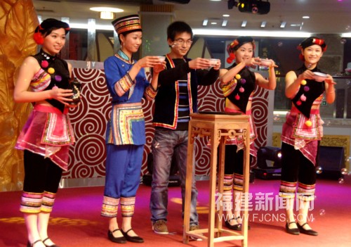 福安红1851茶文化会所里上演畲族“宝塔茶”。(吴惠聪 王东明 摄)