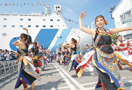 大陆客货两用轮“中远之星”10日首航高雄港,现场邀请原住民舞蹈团迎宾。图片来源:台湾《中国时报》
