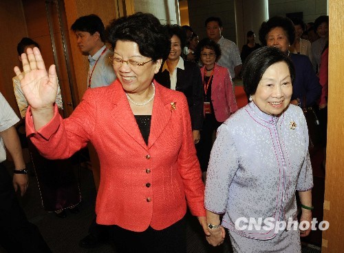 6月20日下午,前来福建厦门参加海峡两岸妇女交流活动暨海峡妇女论坛开幕式的全国人大常委会副委员长、全国妇联主席陈至立(左)与台湾中华妇女联合会主任委员辜严倬云(右)携手步入该妇女论坛会场。当日,作为第二届海峡论坛重要活动之一的海峡两岸妇女交流活动暨海峡妇女论坛在厦门开幕。 中新社发 刘可耕 摄