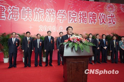6月21日,福建师范大学与台湾世新大学合作办学的福建海峡旅游学院在福建师范大学旗山校区正式揭牌。台湾世新大学副校长熊杰在揭牌仪式致辞中表示,福建海峡旅游学院的创立对两岸教育合作具有里程碑意义,也为两岸未来和谐发展略尽绵薄之力。 中新社发 李玉莲 摄