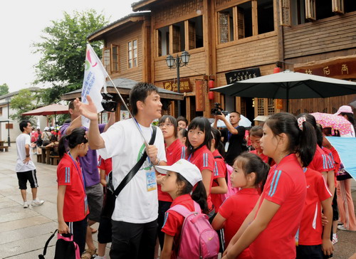 当日,“2010·阳光海峡——两岸快乐小天使活动营”的小朋友来到福州三坊七巷,体验老街民俗文化。“2010·阳光海峡——两岸快乐小天使活动营”7月5日在福州开营,来自台湾的近百名小朋友与大陆小朋友欢聚一堂,他们将共同在福州、泉州、厦门等地度过一段为期8天的美好时光。新华社发(张晨岑 摄)