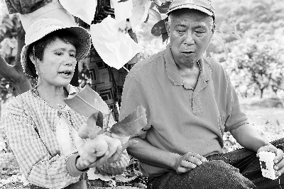 图为何文渊夫妇俩席地而坐,探讨莲雾的色泽和质量。图片来源:福建日报