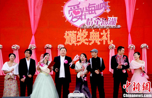 1月16日,历时近半年的“爱在海峡 情牵澎湖”两岸新人爱情故事TV秀大赛在福州落下帷幕,在现场观众的注视下,十对海峡新人在台湾澎湖拍摄的爱情故事TV秀让人感动。中新网发 王东明 摄