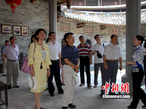 8月2日,台湾高雄县前县长杨秋兴率团在福建省永定县探访著名的客家土楼。同时,与两岸客家文化研究协会共同举办“永定客家土楼与两岸乡土文化交流”座谈会。通过交流,两岸学者认为,无论是大陆还是台湾,乡土文化都同样占据着重要位置,两岸的乡土文化在中华文化的维系下互相碰撞、交融、发展。(刘永良 摄)
