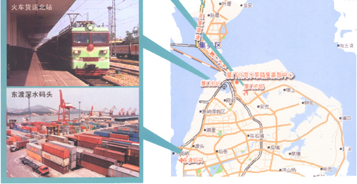 厦门台湾水果销售集散中心位于风景秀丽的厦门市鹭岛北部,东临厦门国际机场,西靠319国道,南距厦门港东渡深水码头2公里,北距厦门大桥500米。具有得天独厚的海、陆、空交通运输区位优势。集散中心建设用地100000平方米,经营面积达45000平方米。自中央政府开放22种台湾水果免税登陆后,已有100多家国内水果经销商和262家台湾果商协会、农业团体、台湾果农及农产品经营商入驻设点经销。