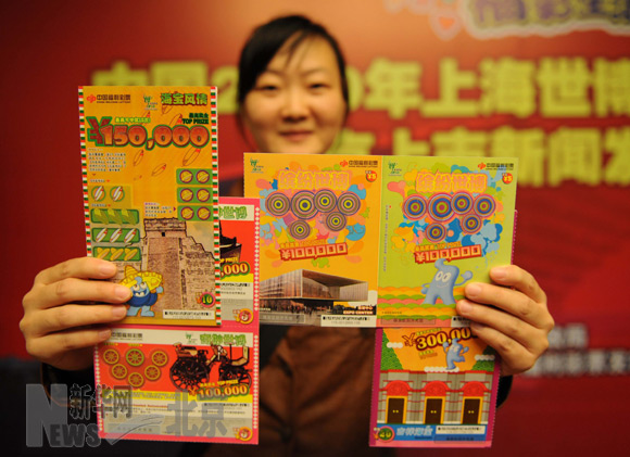 10月18日,北京市民政局的工作人员展示以上海世博会为主题的福利彩票。当天,北京发行上海世博会主题福利彩票。此主题彩票返奖率为65%,最高奖金30万元,彩票募集的公益金将用于四川汶川地震的灾后重建。新华社记者 李文摄