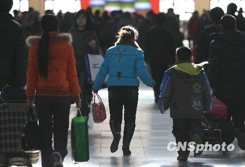 1月21日,一对母子在北京站准备上车。北京铁路局根据北京地区客流特点宣布,从1月20日起北京铁路运输部门进入春运状态,这比全国春运提前了10天,春运将一直持续到3月10日。 中新社发 苏丹 摄