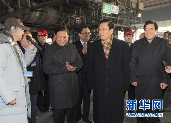 1月13日,中共中央政治局委员、国务院副总理张德江出席首钢北京石景山钢铁主流程停产仪式并发表讲话。这是张德江出席停产仪式后参观已经停产的三高炉。新华社记者马占成 摄