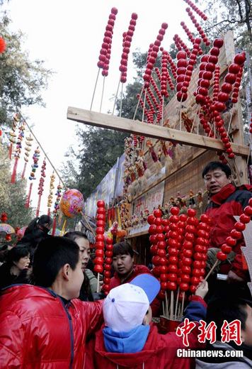 农历正月初六,北京一庙会象征着幸福串串的老北京冰糖葫芦被制作成工艺品,深受儿童及大人的喜爱,争相购买。中新社记者 张勤 摄