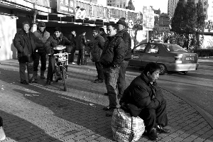 11日,六里桥下西南角,农民工聚在一起等着找工作。本报记者 孙纯霞 摄