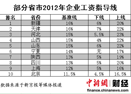 中新网6月19日电(财经频道 李金磊)中新网财经频道统计发现,截至6月19日,目前全国已有10个省份发布了2012年的企业工资指导线。其基准线大多在14%左右,其中新疆和天津基准线最高,达16%,北京基准线最低,为11.5%。