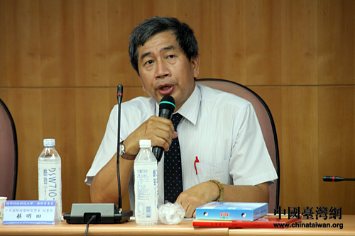 两岸校企合作实践教学创新与电子商务产业发展研讨会综合讨论阶段的主持人、台湾中华国际经贸研究学会秘书长蔡明田。(中国台湾网 王伟 摄)