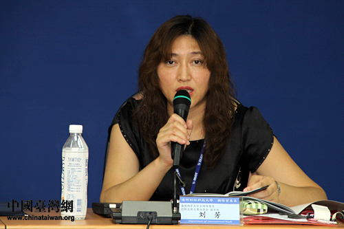建行“e路通”杯首届海峡两岸大学生网络商务创新应用大赛组委会副主任刘芳在研讨会上介绍本届大赛相关情况。(中国台湾网 王伟 摄)
