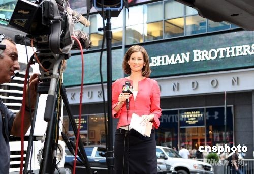 9月15日,美国有着158年历史的第4大投资银行雷曼兄弟公司向法院申请破产保护,当日纽约各大媒体的数十辆转播车移师到雷曼兄弟公司总部外,全天候报道这一震惊华尔街的经济事件。 中新社发 邓悦 摄
