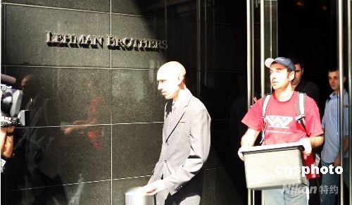 9月15日,美国有着158年历史的第4大投资银行雷曼兄弟公司于向法院申请破产保护,员工当日从雷曼兄弟公司位于纽约的总部大楼内将清理的办公用品搬离公司。 中新社发 邓悦 摄