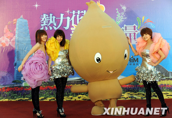 3月8日,台北花博亲善大使S.H.E组合在花博会主题歌发布会上与吉祥物“种子宝宝芽比”合影。