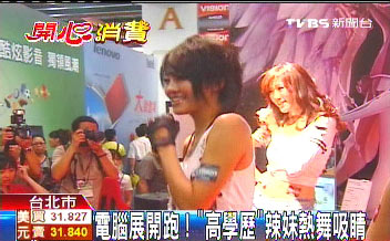 据台湾TVBS电视台报道,台北计算机展大会舞台还没开锣,参展厂商就派巧克力肤色辣妹开始搏版面,没有舞台就在展场地毯展现动感。有的厂商由于和隔壁搞竞争抢眼球,上午11点半的Show Gilr表演,足足提早1小时。