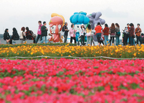 台北花卉博览会6日开幕,大批民众涌进大佳园区,在五彩缤纷的花海前与花博吉祥物合影。 图片来源:台湾《联合报》