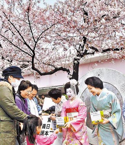 震灾改变日本民众赏樱活动,几名艺妓打扮的女性在东京为灾民向赏花民众募捐。 图片来源:台湾《苹果日报》