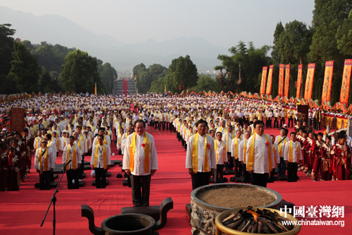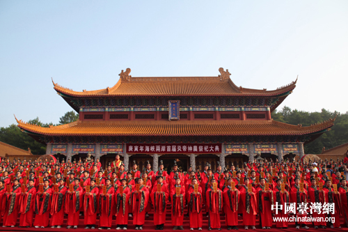 中国台湾网8月12日株洲消息 12日上午,庚寅年海峡两岸首届炎帝神农祭祀大典在炎帝神农氏陵寝地——湖南省炎陵县隆重举行,由台湾“中华神农大帝协进会”组织的台湾约24个宫庙的300多名信众与大陆社会各界人士近万人参加盛典,本次祭祀大典也是台湾民间最大的一次跨海祭祖活动。