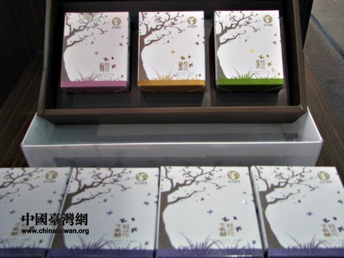台中市东势区大茅埔社区带来了众多桂花相关产品,图为包装精致的多种类桂花糖。(中国台湾网 马迪 摄)