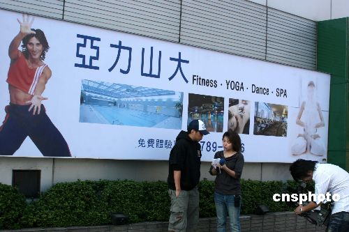 台湾最大健身俱乐部亚历山大无预警停业,引发社会震撼,其创办人唐雅君已被检方限制出境。图为十二月十一日,一家电子媒体在台北街头亚历山大广告看板前进行采访。 中新社发 董会峰 摄