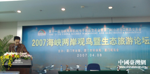 两岸观鸟暨生态旅游论坛由厦门市台湾同胞联谊会、厦门市环保局和厦门市观鸟协会主办,活动时间从8日到11日,以论坛和图片展的形式展现了两岸环保和爱鸟人士对于生态保护的重视,它促进了两岸环保领域的交流,增进了双方的友谊。(徐丽麟)