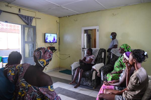11月22日,在塞内加尔达喀尔近郊的辛迪亚村,村民使用“万村通”项目的电视机顶盒观看电视节目。