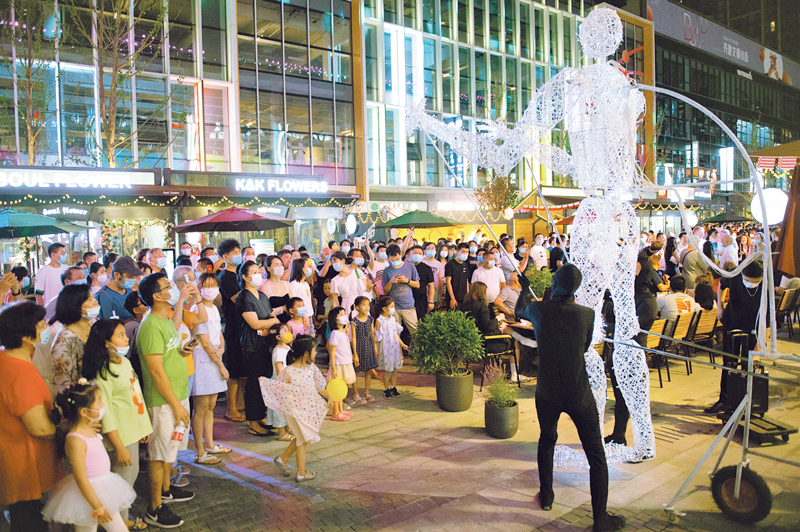 2020年8月8日,北京市朝阳区的“潮朝阳”消费季活动正式重启。图为8日当晚,市民在望京小街商业街观看巨型人偶表演。 新华社记者 陈钟昊/摄