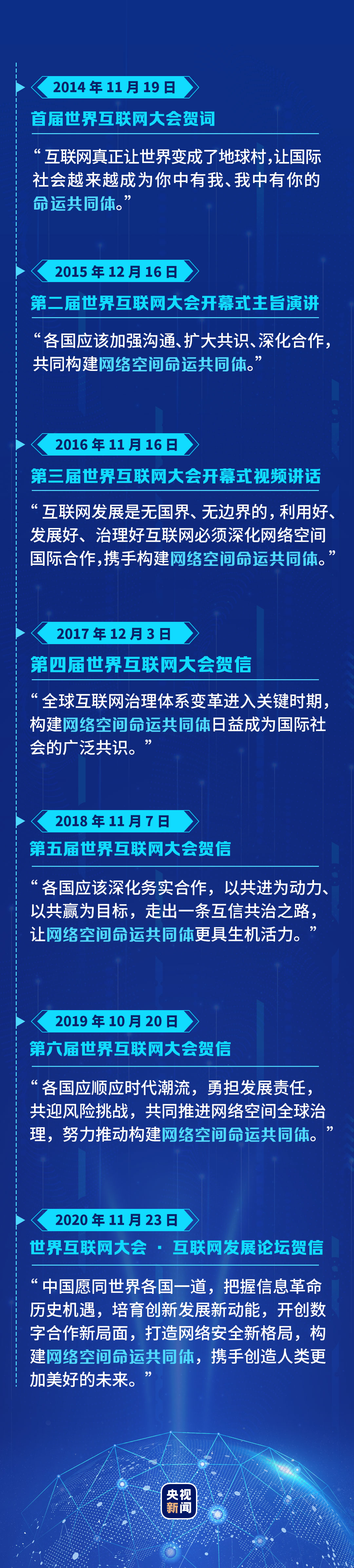 致贺词、出席开幕式并发表主旨演讲、发表视频讲话、致贺信......习近平秉持人类命运共同体理念,就互联网发展大势等作出了一系列具有重大现实意义和深远历史意义的重要论述,为全球互联网治理提出中国倡议、中国方案。