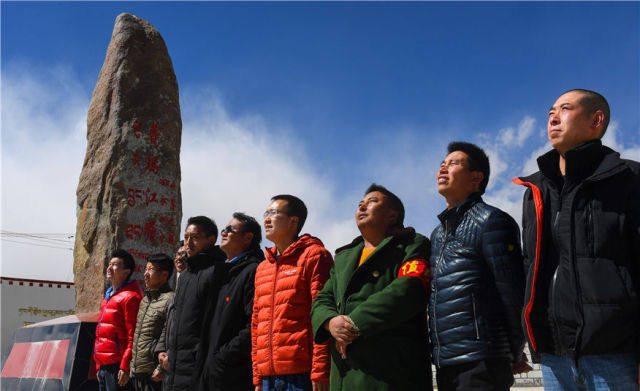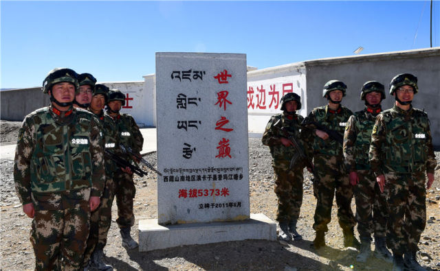 普玛江塘公安边防官兵在海拔碑前合影(1月19日摄)。 新华社记者 觉果 摄