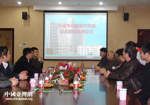 中国台湾网3月14日芜湖消息 日前,“芜湖市台胞医疗保健定点医院”揭牌仪式在安徽芜湖市第二人民医院举行。揭牌仪式由芜湖市台办主任郑锋主持,市生局局长韩肃、市二院院长何思忠、市台协会会长陈鉴章及相关人员出席仪式。由此,该院正式成为芜湖市台商、台胞医疗保健定点医院,为给在芜台商、台胞提供热情、周到、快捷、优质的医疗保健服务开辟了一条绿色通道。