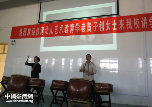 表演者叫黄子翎,台北人,从事戏剧和击鼓表演已近二十年,表演足迹踏过欧、亚、非等大洲。她不仅是位艺术家,还是一位教育者。她用精彩的表演把同学们带入艺术的境地,用自己的切身感受向同学们传授什么是艺术,怎样把艺术的种子散播到幼儿的心中。