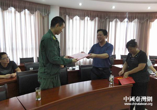 县统战部副部长、台办主任洪建中向项凌渊颁发省台联表彰证书。(图片来源:歙县台办)